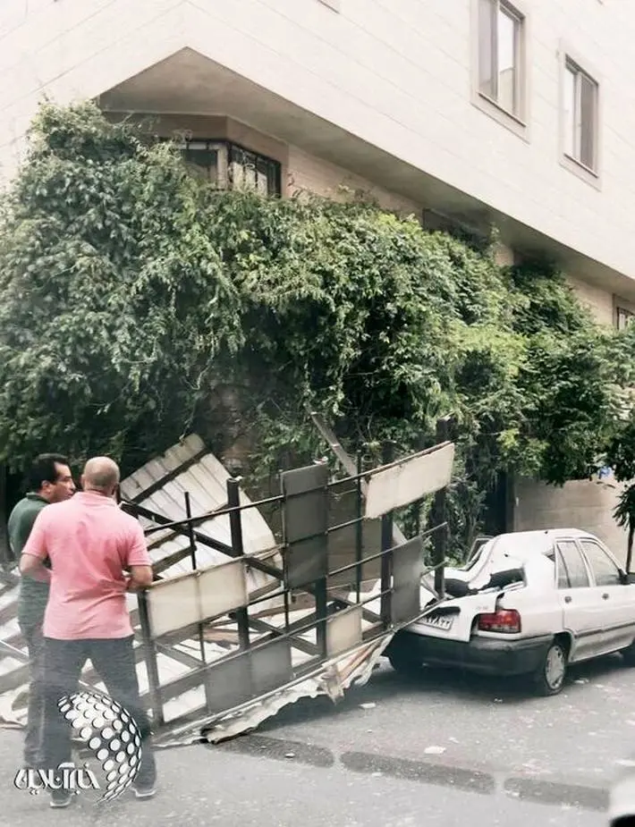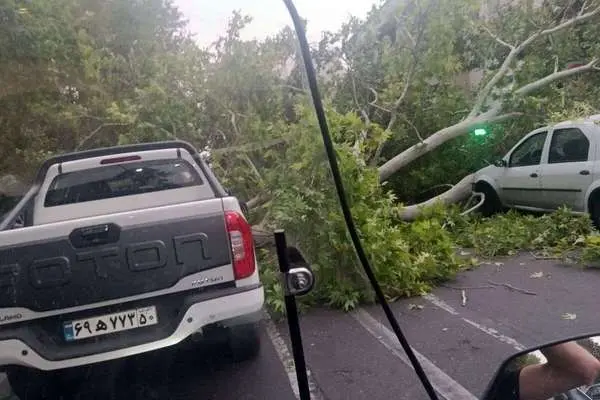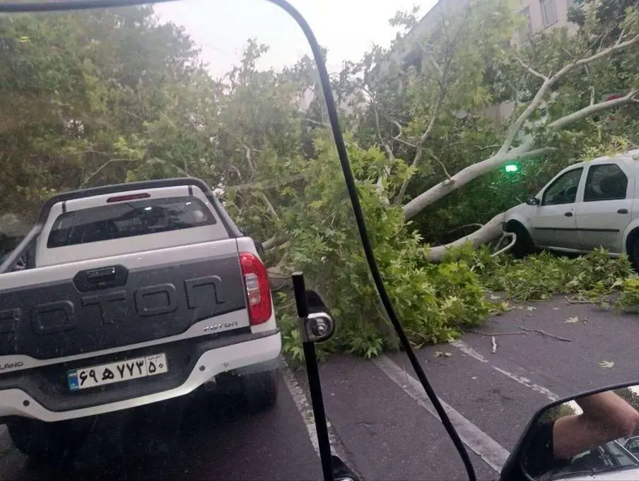 خسارت شدید به یک خودرو در پی طوفان امروز در خیابان دولت تهران