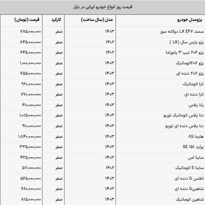 با مطالعه جدول زیر اطلاعات کاملی درباره قیمت روز خودروهای ایرانی در بازار به دست خواهید آورد.