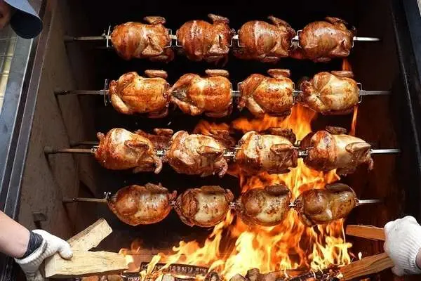 در این ویدئو آشپزهای خیابانی کرهای با چوب بلوط مرغها را کباب میکنند.