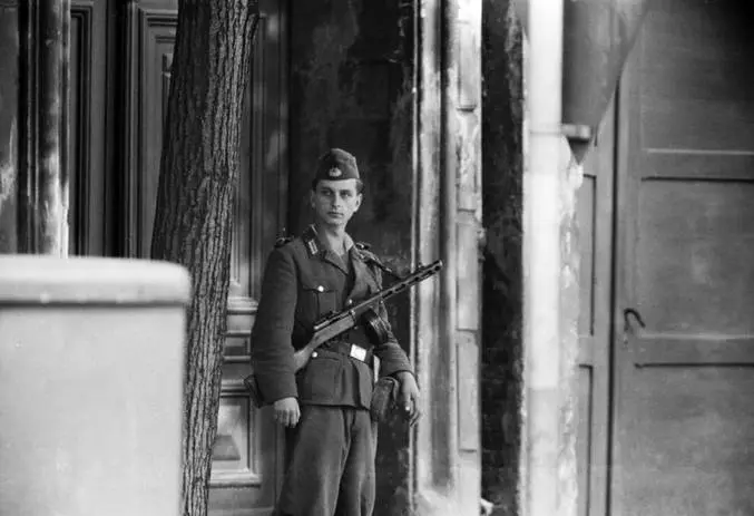یک مرزبان جوان آلمان شرقی پس از بسته شدن تمام نقاط مرزی شرق و غرب در خیابانهای برلین نگهبانی میدهد.