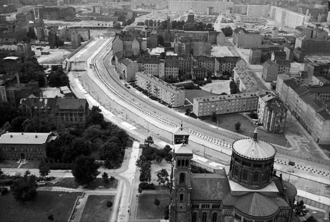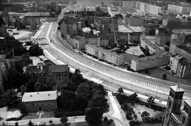 نمای هوایی از شهرِ دو نیم شده برلین. سمت راستِ دیوار برلین شرقی است و در سمت چپ، برلین غربی قرار دارد.