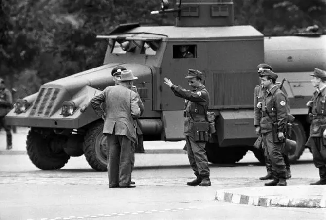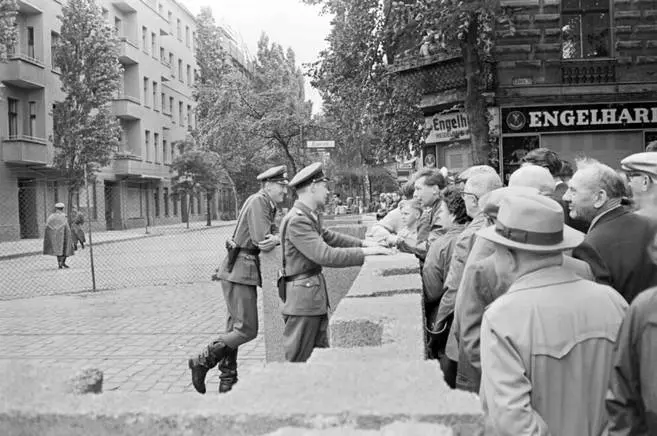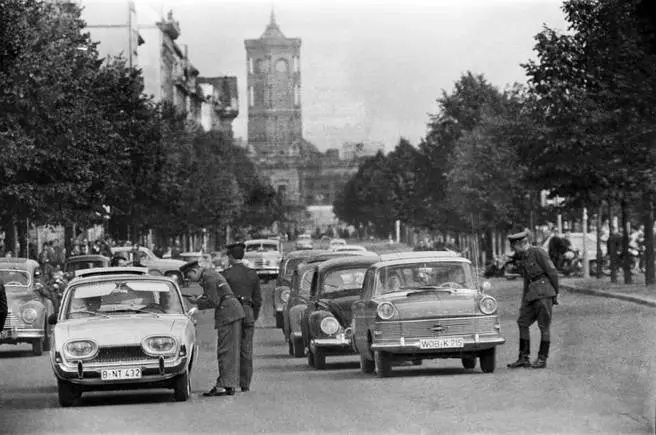 اوایل آگوست ۱۹۶۱ و پس از بسته شدن مرز شرق و غرب، پلیس آلمان شرقی مدارک رانندگان را در خیابانهای برلین بررسی میکند.