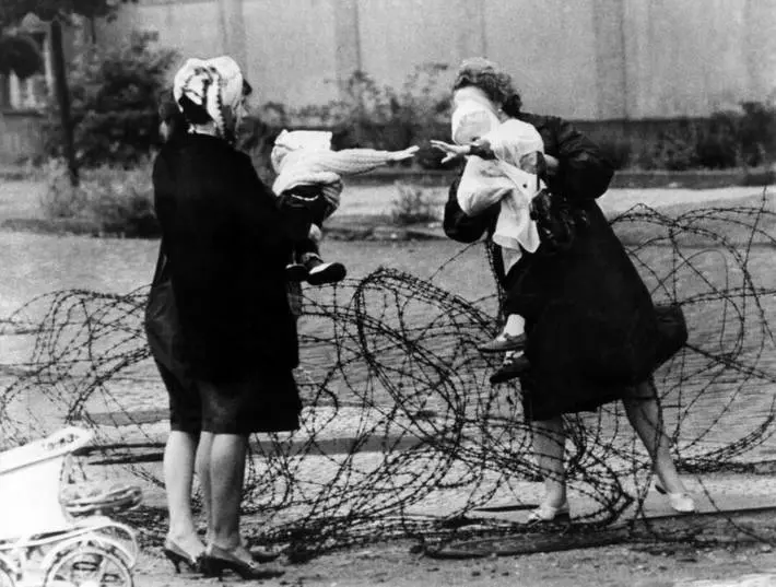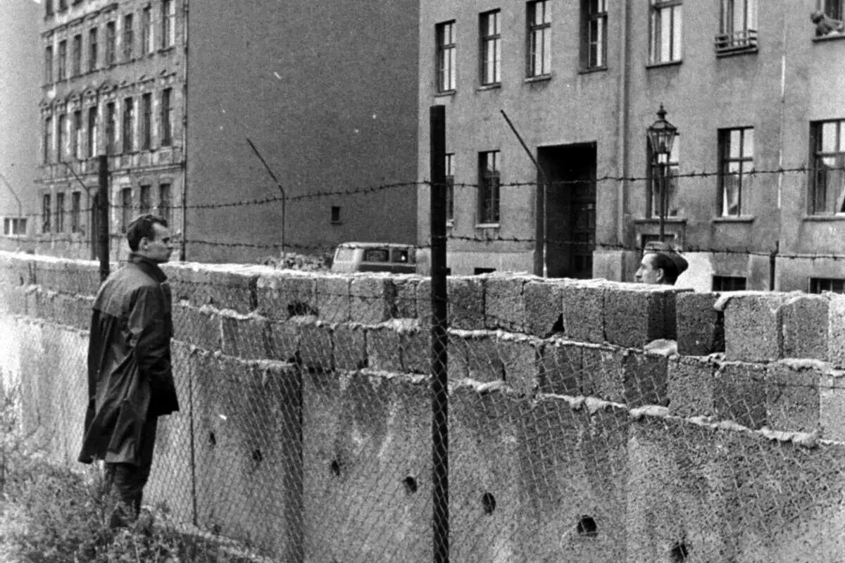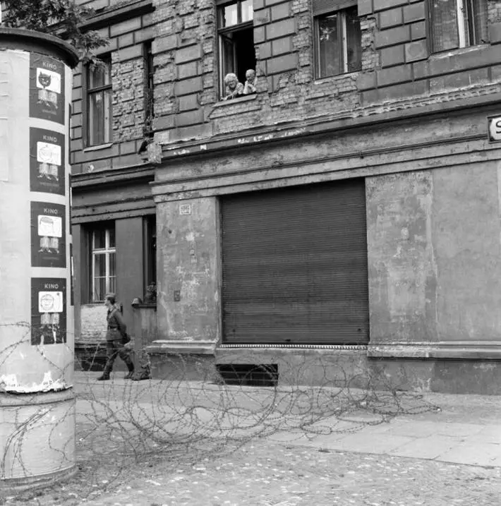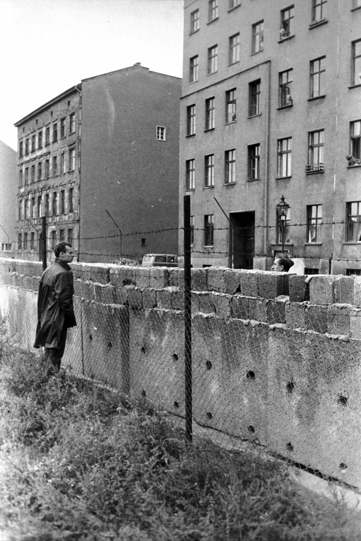 مدت کوتاهی پس از ساخت دیوار، مردی در برلین غربی از بالای دیوارِ چیدهشده با همسایه خود در برلین شرقی گفتگو میکند. موانع خیلی زود برای جلوگیری از برگزاری چنین ملاقاتهایی تشدید و تقویت شدند.