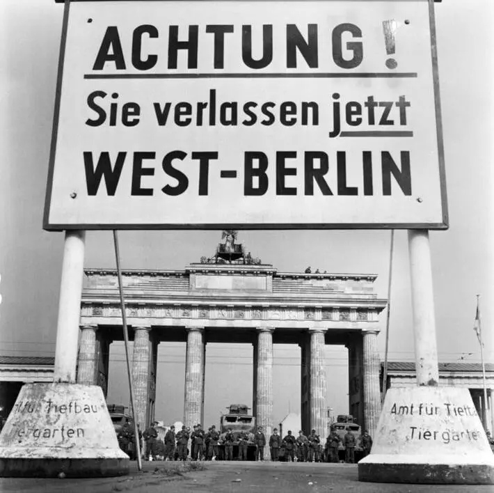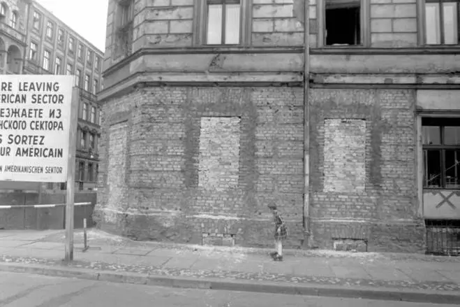 روی تابلو نوشته شده است: «توجه! شما اکنون در حال ترک برلین غربی هستید.» پس از جنگ جهانی دوم، برلین به چهار بخش تقسیم شد: شمال غربی تحت کنترل فرانسه، غرب تحت کنترل انگلیس و ایالات متحده که بخشهای جنوب غربی شهر را کنترل میکرد، در حالی که کل قسمت شرقی برلین به اتحاد جماهیر شوروی اختصاص یافت.