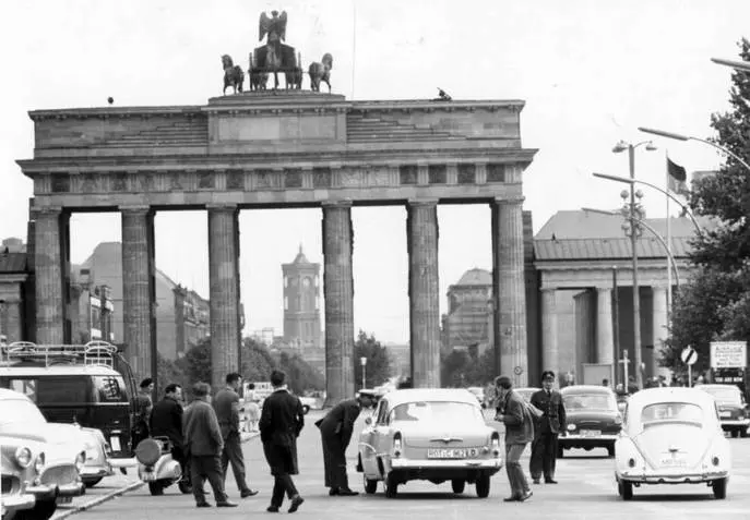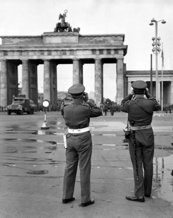 افسران پلیس برلین غربی، که در اینجا در ۲۱ آگوست ۱۹۶۰ تصویر شدهاند، قبل از عبور رانندگان از زیر دروازه براندنبورگ به برلین شرقی با آنها صحبت میکنند. تقریباً یک سال بعد، این دروازه شاخص که قرار بود بخشی از دیوار برلین را تشکیل دهد، از سوی شرق بسته شد.