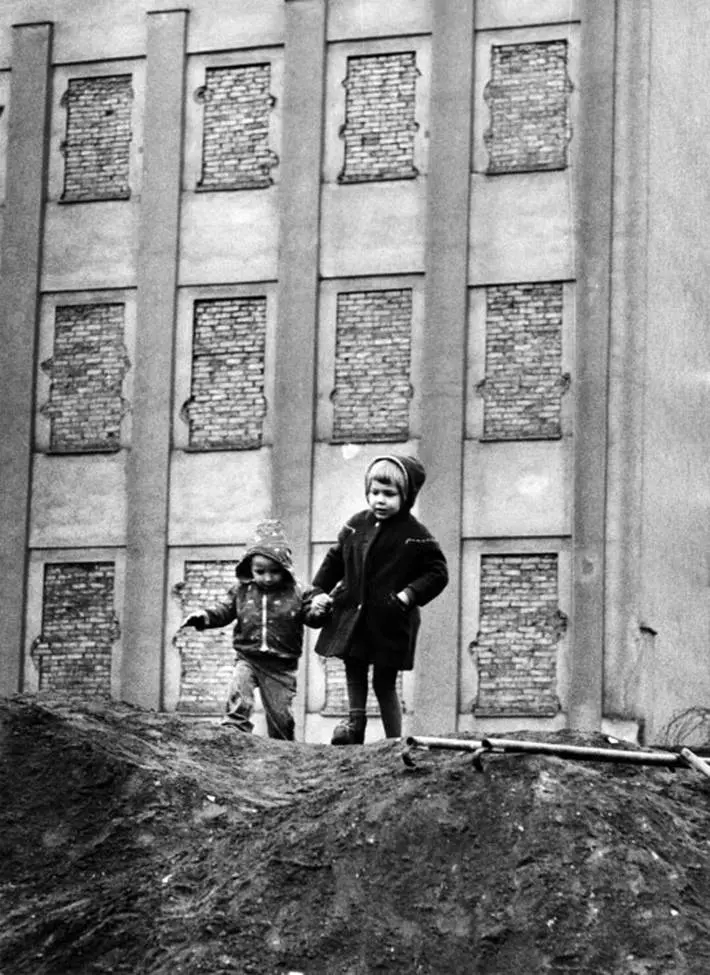 کودکی سوار بر اسکیت از خیابانی در منطقه کروتسبرگ در شرق برلین عبور میکند. نزدیکی خیابان به دیوار به این معنی است که پنجرههای زیرزمین خانه با آجر پر شدهاند تا از تسهیل فرار به سمت غرب جلوگیری شود.