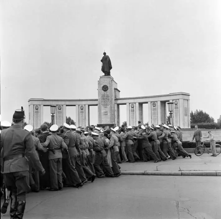 این عکس که سه روز پس از دیوارکشی گرفته شده است، پلیس برلین غربی را نشان میدهد که جمعیت عظیمی از تظاهراتکنندگان علیه مجزاسازی شهر را در خیابانهای نزدیک بنای یادبود جنگ شوروی مهار میکند.