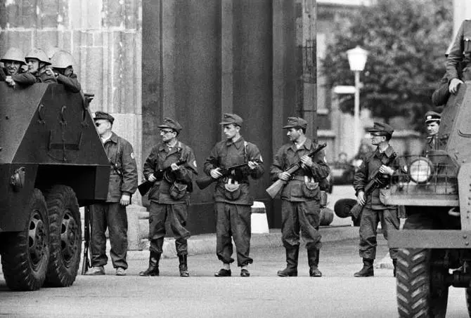 اعضای «گروه رزمی طبقه کارگر»، سازمان شبهنظامی آلمان شرقی، از گذرگاه مرزی نزدیک دروازه براندنبورگ محافظت میکنند.