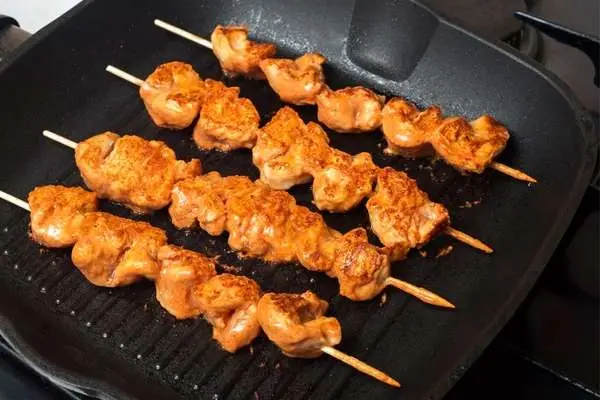 پس از اینکه گوشت مرغ طعم دار شد، آنرا از یخچال خارج می کنیم. حالا سیخ های چوبی را چند دقیقه داخل آب سرد می خیسانیم و داخل هر سیخ ۴ تا ۵ تکه گوشت مرغ قرار می دهیم. یک تابه مناسب روی حرارت متوسط قرار می دهیم.