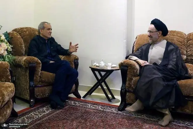 سید محمد خاتمی، رئیسجمهوری پیشین، با حضور در منزل پزشکیان در تهران با او دیدار کرد و پیروزیاش در انتخابات ریاستجمهوری اخیر را تبریک گفت.