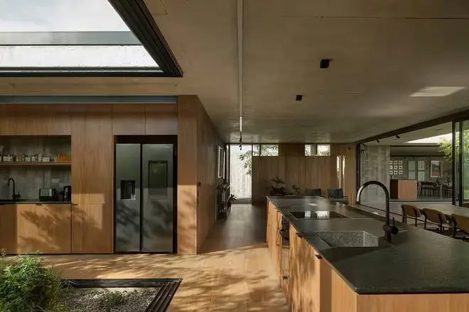 پس از ورود، بازدیدکنندگان از یک حیاط زیبا دارای خرده سنگ عبور میکنند که چند درخت اقاقیا در آن قرار دارند. این اولین پاسیو به عنوان یک گذار عمل کرده و سرعت زندگی را پیش از ورود به قلب خانه کاهش میدهد. هرچه بیشتر به سمت مرکز خانه حرکت کنید، سه پاسیو متمایز دیگر را کشف خواهید کرد که هر کدام نور طبیعی و تغییر سایههای محیط را قاب میکنند.