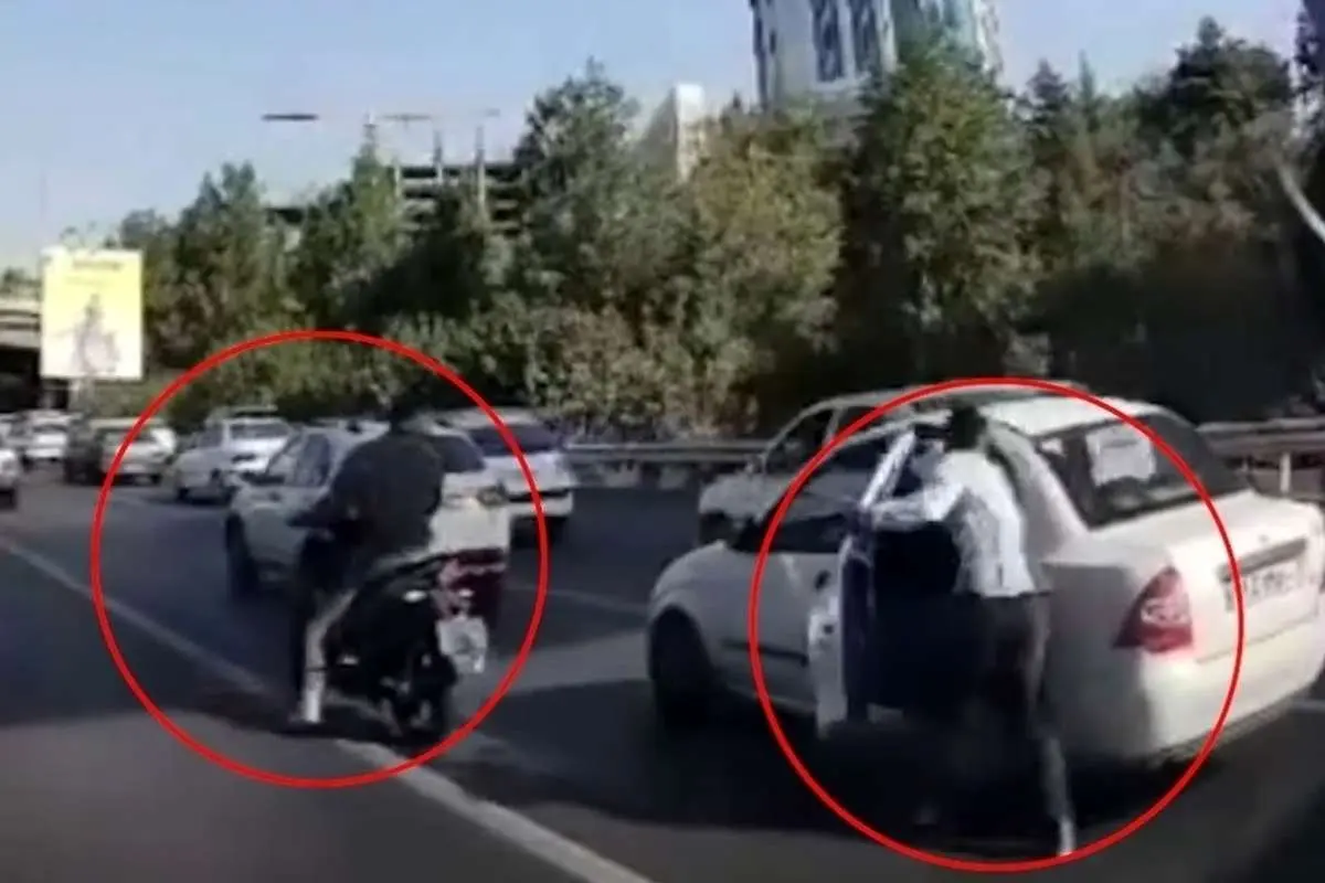در این ویدیو میبینید که چطور یکی از سرنشینان یک موتورسیکلت بیپروا در اتوبان همت تهران از موتور پیاده شده و درب ماشین را بهسادگی باز کرده و گوشی مسافر را سرقت میکند.