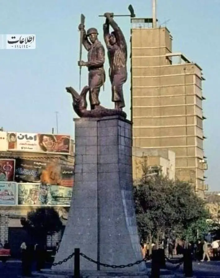 در سال ۱۳۴۹ این مجسمه برداشته شد و مجسمه دیگری در این میدان نصب شد که فرد نظامی و غیر نظامی را در حال مبارزه با یک اژدها مجسم میکرد. این مجسمه تا سال ۱۳۵۷ در این تقاطع قرار داشت. در روزهای انقلاب این مجسمه تخریب شد و چند ماه بقایای مجسمه سرنگون شده در میانه میدان قرار داشت.