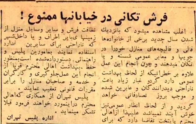 ۶۰ سال پیش پلیس تهران با صدور اعلامیهای از شهروندان خواست به منظور جلوگیری از سد معبر و کاهش دید رانندگان از شستن و تکاندن قالی و قالیچه در معابر خودداری کنند.