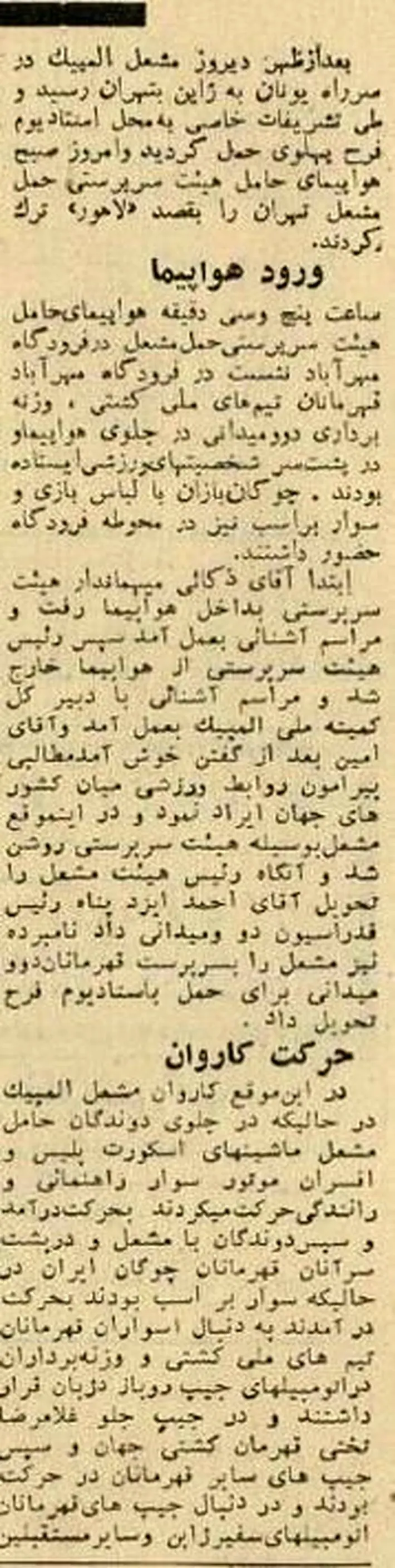 عصر روز ۴ شهریور ۱۳۴۳ هواپیمای مخصوص حمل مشعل المپیک ۱۹۶۴ توکیو در فرودگاه مهرآباد فرود آمد.