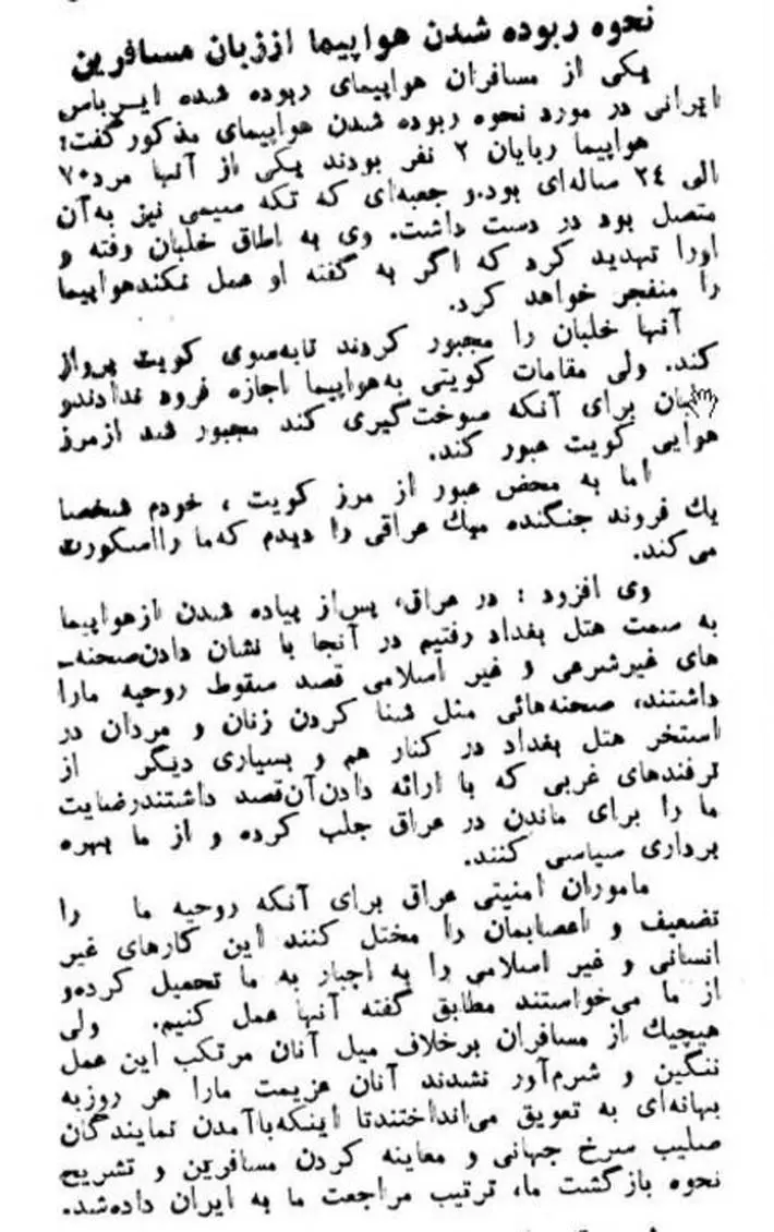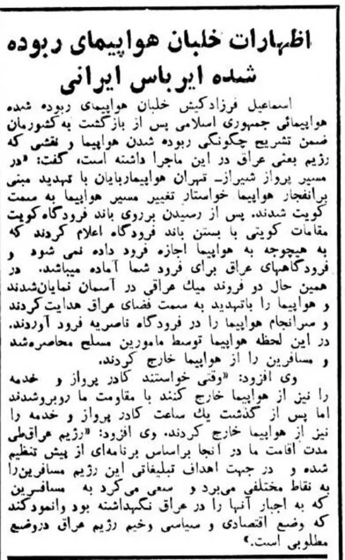 به گزارش اطلاعات آنلاین، در ۶ شهریور ۱۳۶۳ یک فروند هواپیمای ایرباس خطوط هوایی جمهوری اسلامی ایران در یک پرواز داخلی در مسیر شیراز به تهران ربوده شد. این هواپیما بعد از آن که نتوانست در فرودگاه کویت برای سوختگیری فرود بیاید در فرودگاه بغداد روی زمین نشست.