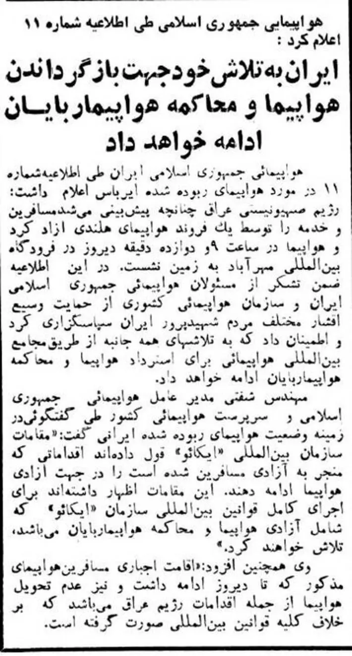 ۴۰ سال پیش یک هواپیمای ربوده شده مسافربری خطوط ایران بعد از یک هفته از بغداد به ایران بازگشت.