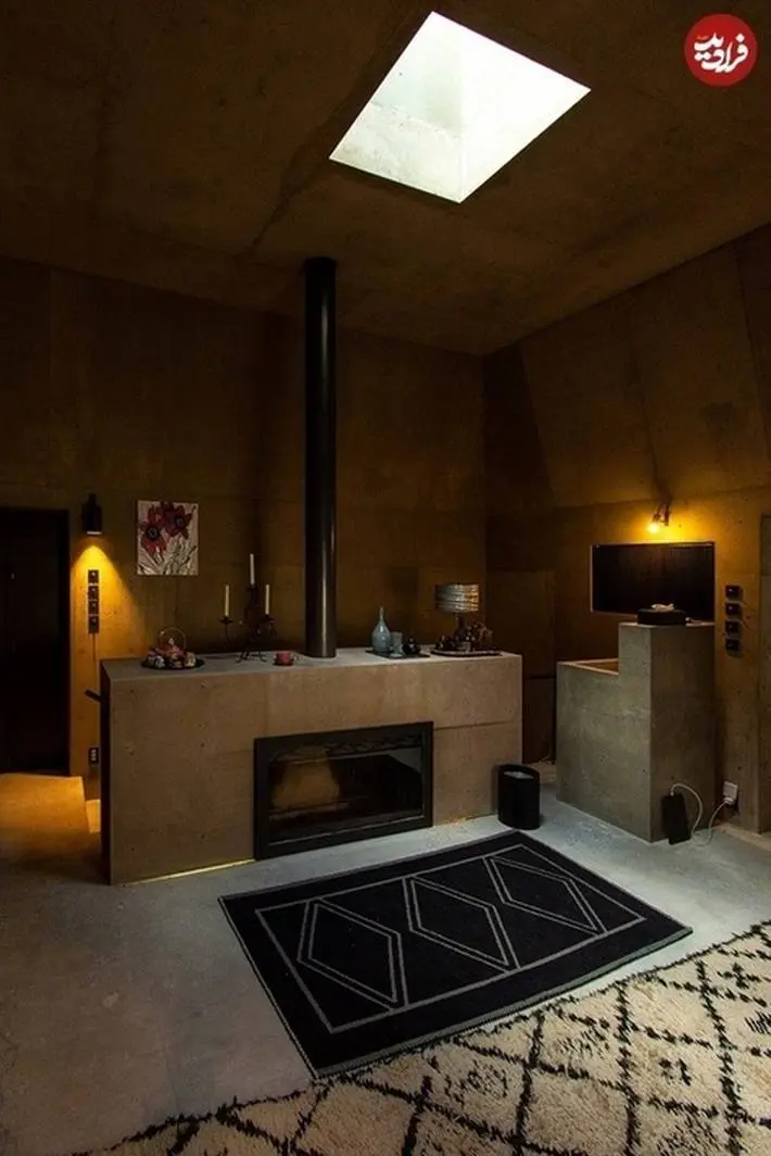 داخل اتاق مطالعه پر از صفحات بتنی و یک شومینه بتنی است. نورگیر و ورودی مشرف به باغ آبی، نور طبیعی این فضا را فراهم میکنند.