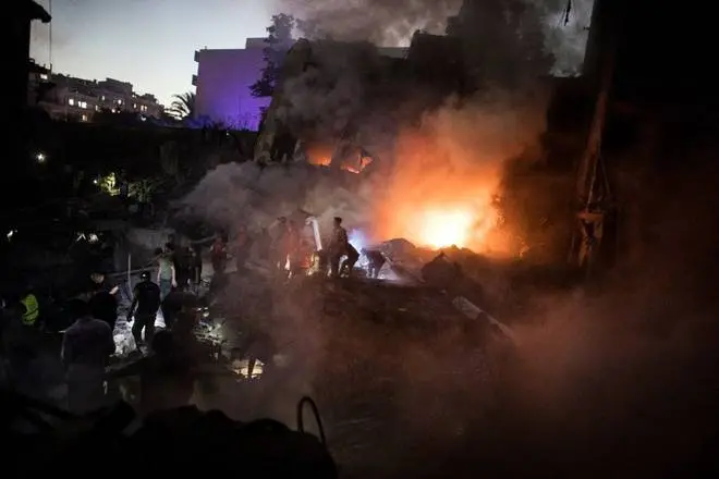 (تصاویر) آواربرداری در محل حمله رژیم صهیونیستی در ضاحیه بیروت
