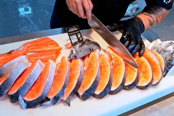 (ویدیو) فرآیند دیدنی برش ماهی سالمون و تهیه سوشی توسط آشپز چینی