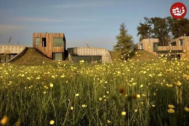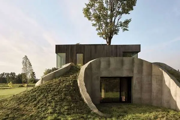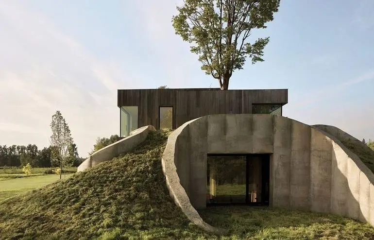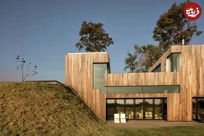 بخشهایی از این خانه انگار در دل زمین فرورفتهاند و با گذشت هزاران سال، خاک اطراف آنها را پوشانده است؛ از سوی دیگر بخشهای دیگری از خانه با نمای شیشهای خود جلوهای کاملا مدرن دارند که یک تضاد زیبا و شگفتانگیز را در کل مجموعه ایجاد میکند.