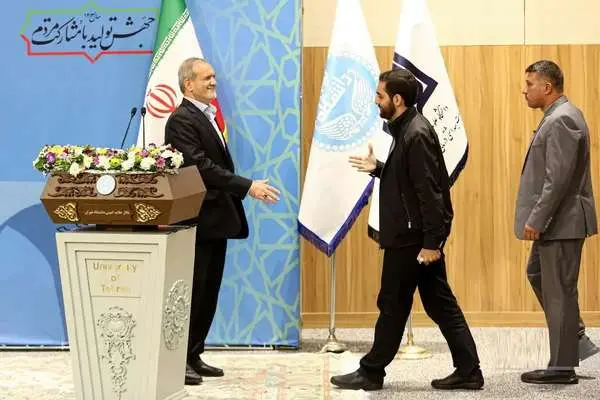 تصویری از برهم زننده سخنرانی پزشکیان در دانشگاه تهران منتشر شده است که درحال راه رفتن و خوش و بش با سعید جلیلی است.