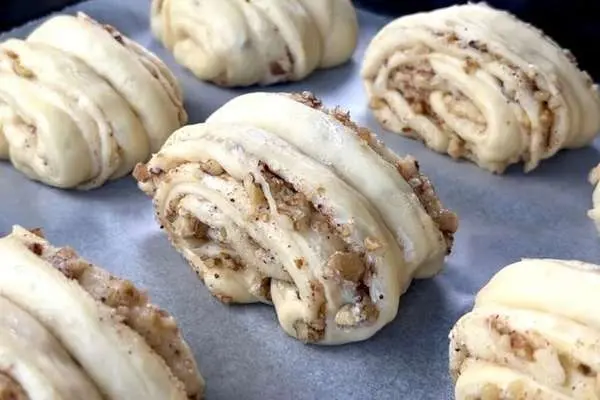 در این ویدئو یک آشپز کانادایی با مواد اولیه شامل: ۲۰۰ میلی لیتر شیر ولرم، ۱۰۰ میلی لیتر آب ولرم، ۶۰ گرم شکر، ۹ گرم مخمر، ۲ عدد تخم مرغ، ۴ گرم نمک، ۷۰۰ گرم آرد، ۲۰۰ گرم گردو، مقداری دارچین، ۲۰۰ گرم کره و یک عدد زرده تخم مرغ این شیرینی را درست میکند.