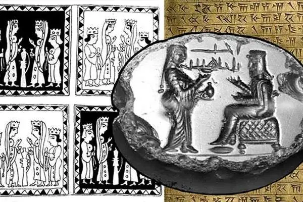 مهر استوانه‌ای که ملکه ایرانی باستان را در حال ملاقات با یک دختر جوان و زن نجیب نشان می‌دهد