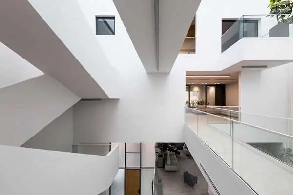 در خانه ساعد، طبقات مختلف از طریق راهپلههای مدرن و باز با هم ارتباط دارند و فضاهای نشیمن بزرگ و نورگیر، با نور طبیعی فراوان از طریق بازشوهای سقفی و دیواری روشن شدهاند. فضای باز میانی و تقسیمبندیهای شفاف، باعث ایجاد حس وسعت و جریان آزادانه هوا و نور در داخل ساختمان شده است. طراحی سقفهای بلند و استفاده از سطوح شیشهای در کنار راهپلهها، به گسترش حس دلبازی و ارتباط بین طبقات مختلف کمک میکند.
