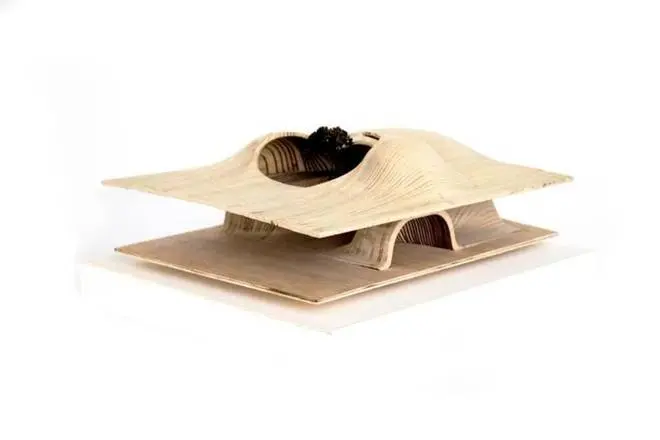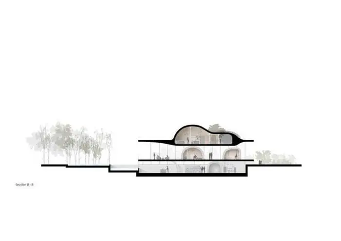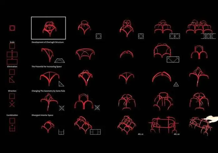 در نتیجه، مرز غیرقطعی و مبهمِ درون و بیرون هر کدام از طبقات بهصورت متفاوتی شکل گرفتهاست. نیمگنبدهای طبقات بالا و پایین بروی هم مینشیند و نحوه انتقال نیرو که به اسلاف چهارطاقی نزدیک است باعث میشود فضایی دورگه به وجود بیاید که در مرز مکعب و فرمهای گنبدی قرار بگیرد.
