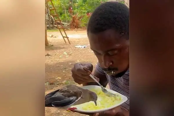 دوستی عجیب مردی با پرندهاش؛ در یک بشقاب غذا میخورند! (ویدئو)