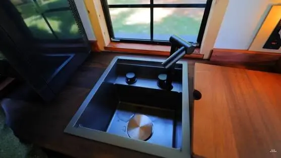 آشپزخانه بسیار ساده است و دارای مخازن آب برای آب آشامیدنی و فاضلاب، یک فیلتر و یک سامانه پمپ، و همچنین یک آبگرمکن است. یک یخچال کوچک نیز برای نوشیدنیها یا مواد غذایی وجود دارد. یک اجاق برقی در دسترس است که در زمان عدم نیاز درون یک کشو قرار میگیرد. سینک دارای یک شیر آب تاشو است و در مواقعی که استفاده نمیشود یک تخته آشپزی روی آن را میپوشاند. این جزئیات کوچک راه حلهای عالی برای صرفه جویی در فضا در چنین خانه جمع و جوری هستند.