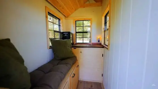 داخل خانه شامل یک اتاق و بسیار دنج و راحت است. ورودی شما را به یک فضای نیمکت نشیمن هدایت میکند که میتواند سه نفر را در خود جای دهد. این نیمکت مجهز به فضای ذخیره سازی یکپارچه و یک واحد گرمایش و سرمایش تهویه مطبوع است.