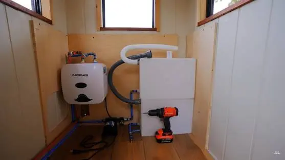 حمام به دو بخش تقسیم شده است - دیوار جلویی نزدیک ورودی شامل دوش بیرونی است، در شرایطی که دیوار پشتی دارای یک جعبه ذخیره سازی با یک توالت کوچک سبک کمپینگ است. در صورت نیاز به حفظ حریم خصوصی میتوان این جعبه را به داخل خانه برد.