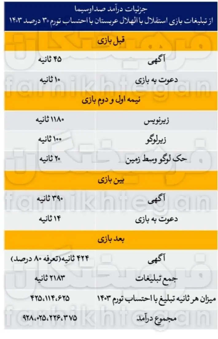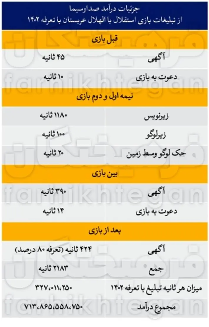 بازی که تمام شد و استقلال در برابر الهلال نتیجه نگرفت بسیاری از هواداری از سر ناراحتی تلویزیونها را خاموش کردند، اما تلویزیون از تبلیغ دست نکشید و حدود ۷ دقیقه و ۴ ثانیه تبلیغ پخش کرد که براساس دستورالعمل پخش اداره کل بازرگانی سازمان صداوسیما، چون پس از این بازی مسابقه فوتبال دیگری نیست این تبلیغات باید در نسبت با باقی آگهیها ۲۰ درصد کمتر محاسبه شود. اگر بخواهیم مجموع رقمی را که از این مسابقه نصیب صدا و سیما شد، محاسبه کنیم، عددی ۷۱۳.۸۶۵.۵۵۸.۷۵۰ میلیارد تومانی را در برابر خود میبینیم که با احتساب تورم ۳۰ درصدی در سال ۱۴۰۳ به رقم ۹۲۸.۰۲۵.۰۰۰.۰۰۰ میرسد.