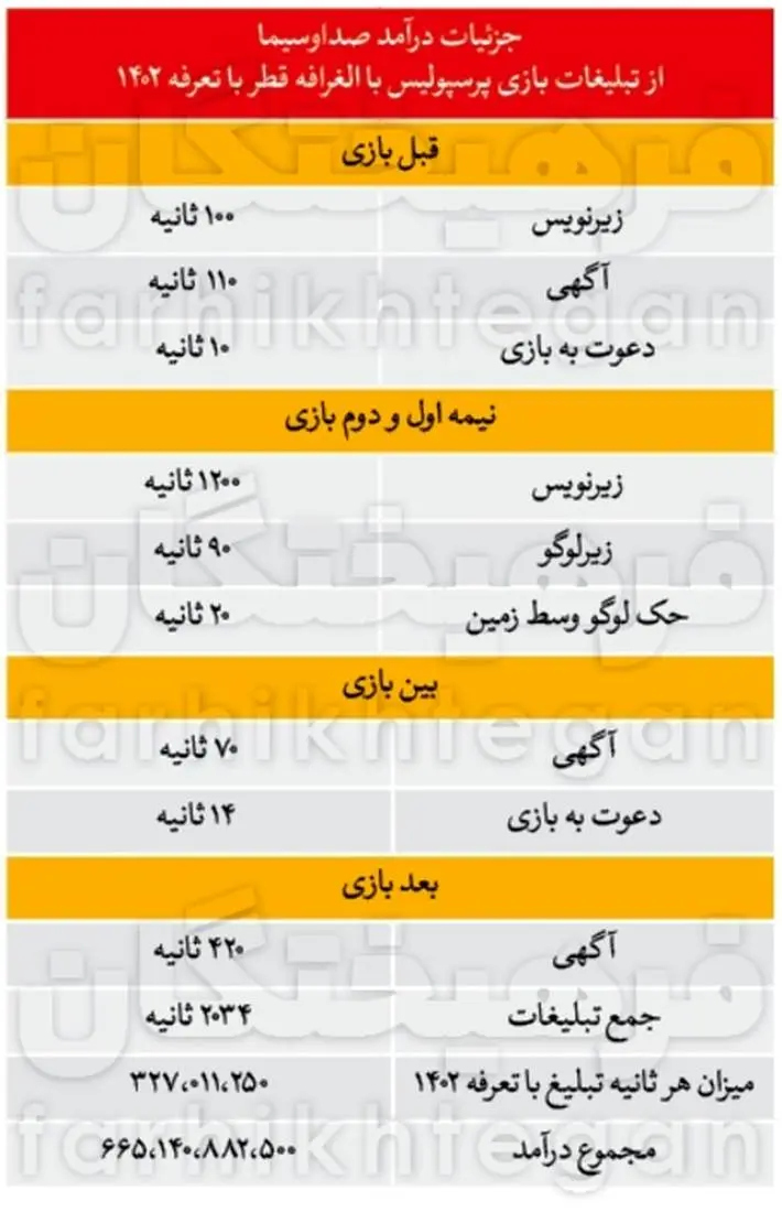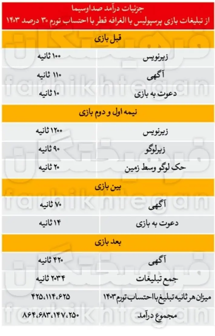 دوشنبه قبل از آنکه سوت شروع بازی پرسپولیس زده شود، تلویزیون ۱۱ زیرنویس تبلیغاتی را حین صحبتهای اسماعیل هلالی، بازیکن سابق پرسپولیس با محمدرضا احمدی پخش کرد، جدای از این احمدی ۱۱۰ ثانیه تبلیغات دو برند را انجام داد و پیش از آغاز مسابقه هم برای دعوت به بازی ۱۰ ثانیه تبلیغ پخش شد. در مجموع، پیش از آغاز بازی پرسپولیس، تلویزیون ۲۲۰ ثانیه تبلیغ پخش کرد که براساس تعرفه ۳۲۷.۰۱۱.۲۵۰ میلیون تومانی تبلیغات در سال ۱۴۰۲، عددی بیش از ۷۱ میلیارد تومان نصیب صداوسیما شده است. البته اگر تعرفه را با احتساب تورم ۳۰ درصدی در سال ۱۴۰۳ بگیریم، درآمد تلویزیون تنها پیش از شروع بازی پرسپولیس، رقمی بیش از ۹۳ میلیارد تومان میشود. تمامی این ارقام برای پیش از آغاز مسابقه است.