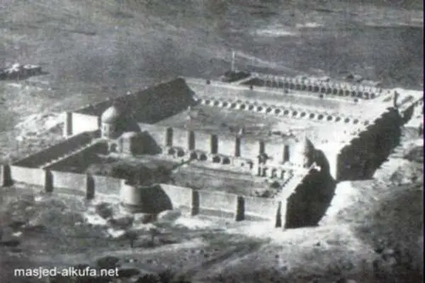 عکس هوایی از مسجد کوفه که در وسط «خان الوقف» قرار دارد و در پایین تصویر صحن و حرم مسلم دیده می شود. این عکس در سال ۱۹۱٥ گرفته شده است.
