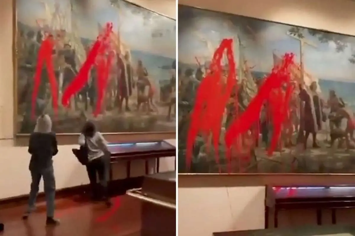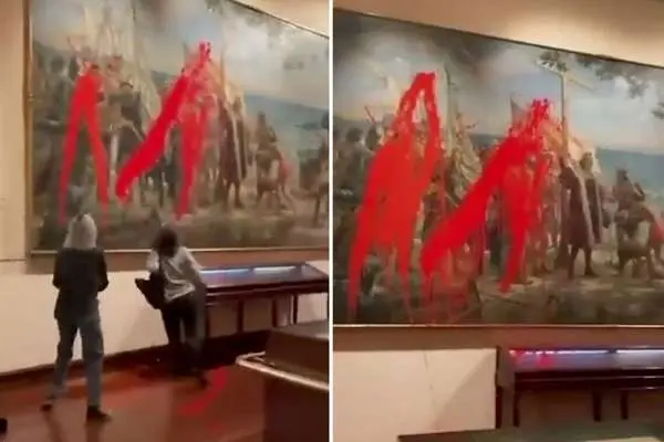 گروهی از فعالان محیط زیست با پاشیدن رنگ قرمز روی نقاشی «نخستین ادای احترام به کریستف کلمب» اثر خوزه گارنگلو در موزه نیروی دریایی مادرید، اعتراض خود را به نمایش گذاشتند.