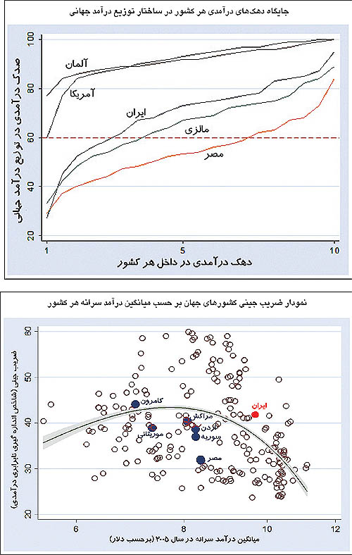 چیزی که ممکن است عده بسیاری را دچار حیرت کند - همانطور که مرا واقعا متعجب کرد- این مساله است که توزیع درآمد ایران (در سال 2005) بدتر از توزیع درآمد آمریکا به نظر می‌رسد، هرچند هر دوی این کشورها شاخص جینی یکسانی -در حدود 40/0 الی 45/0- دارند. در واقع به نظر می‌رسد ایران تقریبا بدترین وضعیت توزیع درآمد را در بین این گروه از کشورها داراست.
