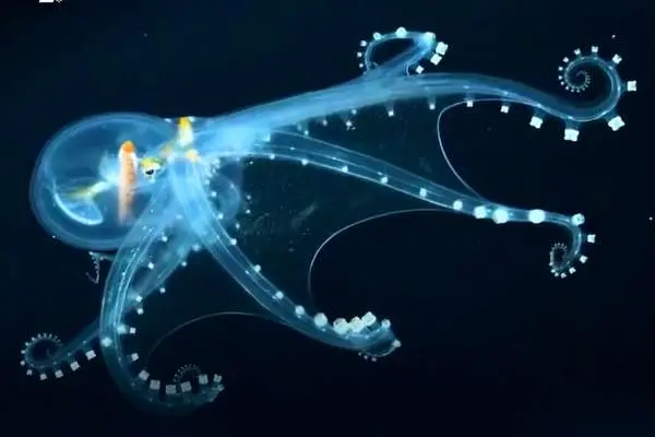 اختاپوس شیشهای، یکی از اسرارآمیزترین جانداران اعماق اقیانوس، با بدنی تقریباً کاملاً شفاف در ژرفای تاریک دریاها زندگی میکند.