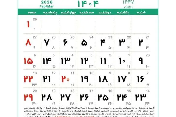 به گزارش فرارو، اسفند مصادف با ماه قمری رمضان نیز است. به همین دلیل انواع  تعطیلات و مناسبات ملی و مذهبی را در خود جای داده. در ادامه نگاهی به تقویم اسفند 1404 خواهیم داشت.