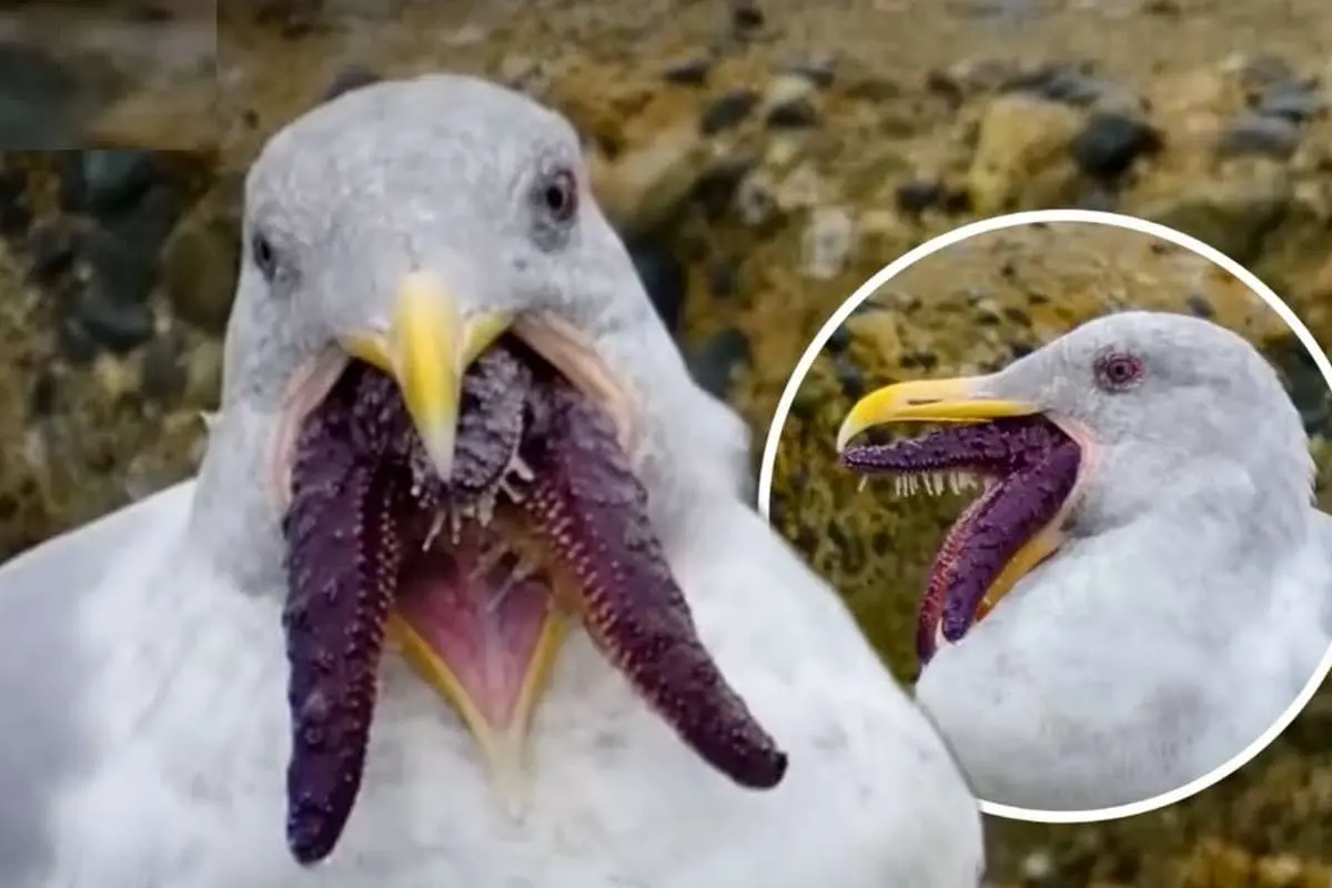 تلاش مرغان دریایی برای بلعیدن ستاره دریایی