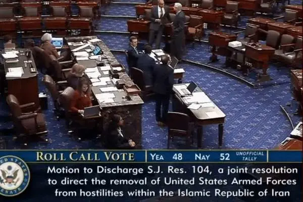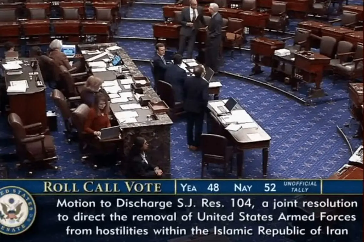 سناتورهای آمریکایی بامداد پنجشنبه با ۵۲ رأی مخالف و ۴۸ رأی موافق، طرح محدود کردن اختیارات جنگی رئیس جمهور آمریکا و پایان حملات به ایران را رد کردند.