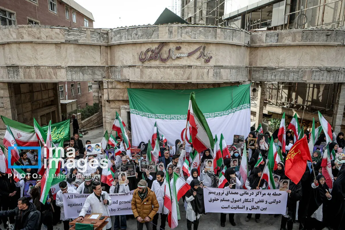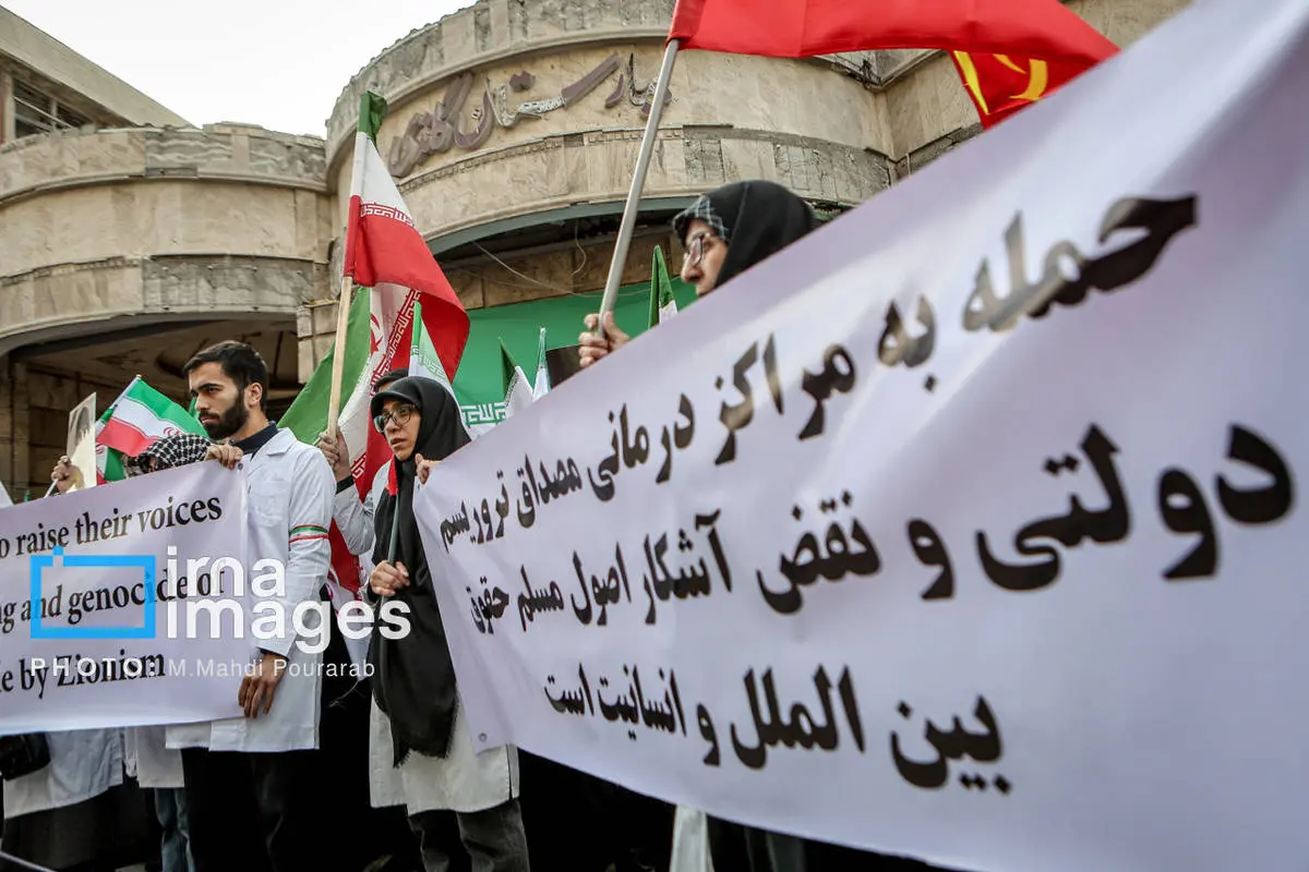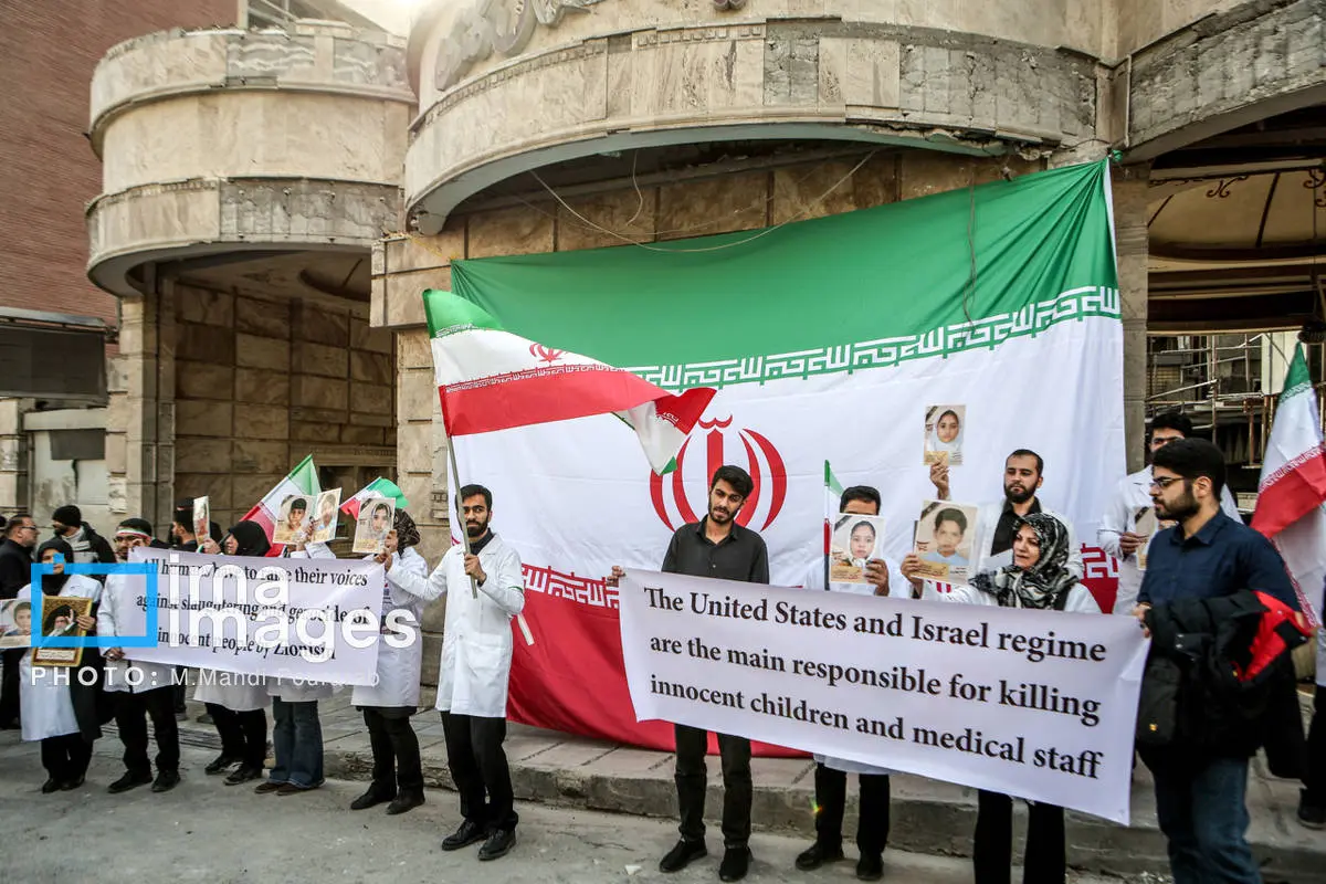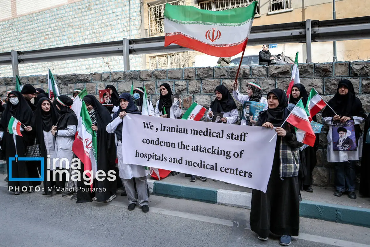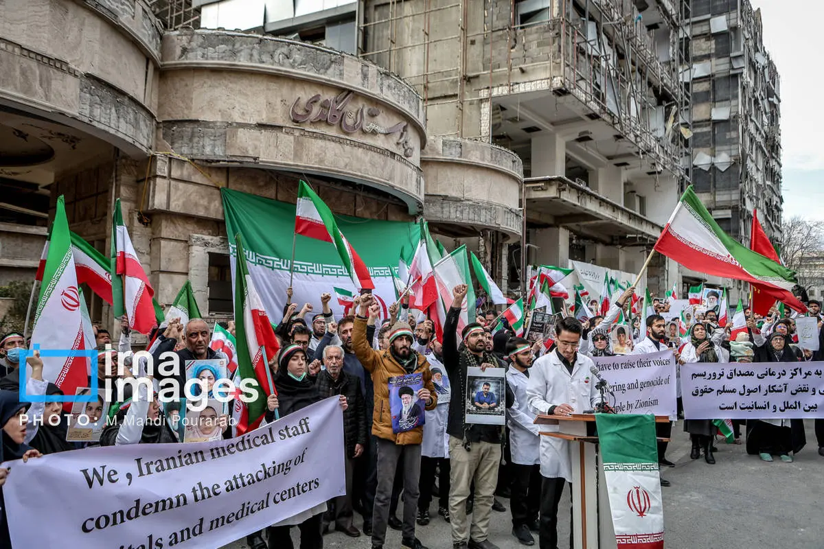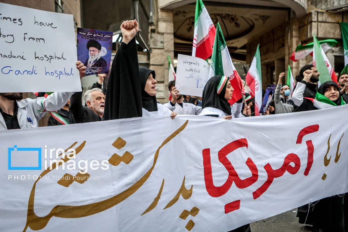 کادر درمان کشور در اعتراض به حملات هوایی آمریکا و رژیم صهیونیستی، عصر شنبه (۱۶ اسفند ۱۴۰۴) مقابل بیمارستان گاندی تجمع کردند.
