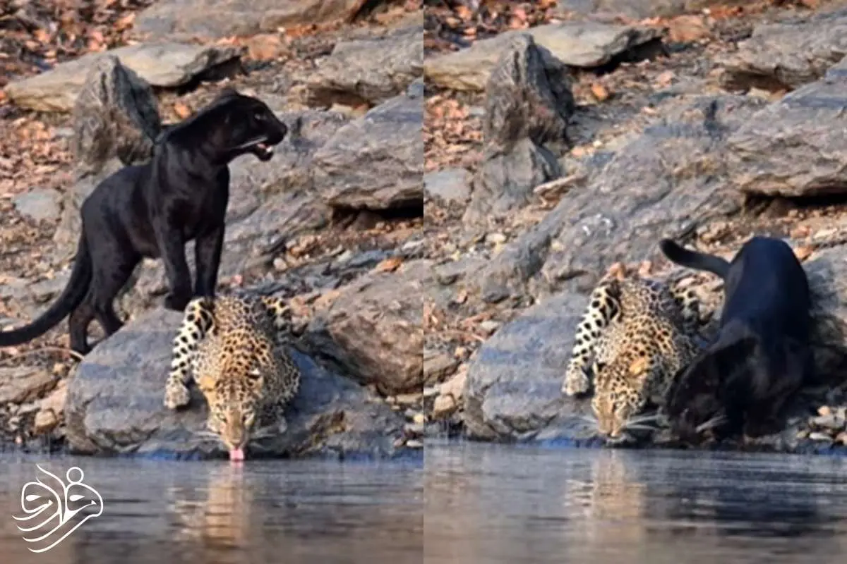 در پارک ملی بهدرا هند، تصویری کم‌نظیر از آرامش و همزیستی ثبت شد: یک پلنگ سیاه و یک پلنگ آسیایی در سکوت کنار هم آب می‌نوشند و انعکاس‌شان روی آب صحنه‌ای خیره‌کننده خلق کرده است.